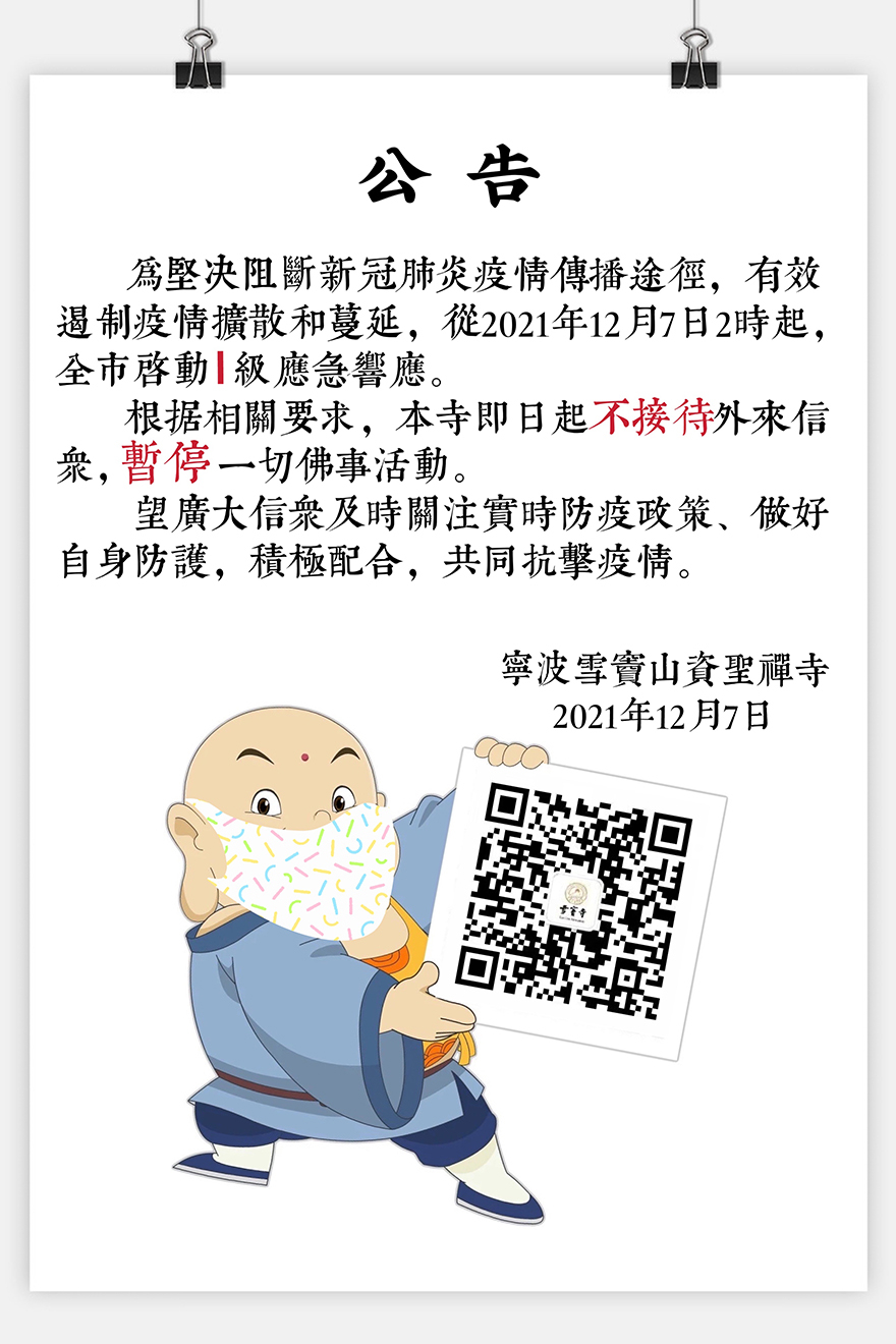 12月7日,宁波雪窦山资圣禅寺发布“双暂停”通知,以下为通知全文: