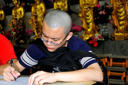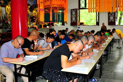 虽然近几日哈尔滨遭遇到多年未遇的大雨,但这并未影响大家向往丛林生活和修学佛法的热情,报到的时间还未到,但来自全国各地的四百五十名学员陆续来到极乐寺,等待短期出家的第一项任务——佛学基础考试。