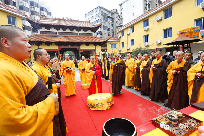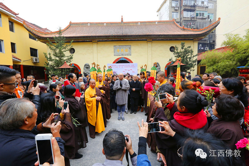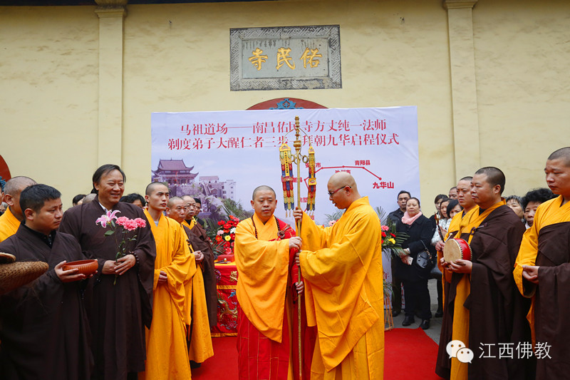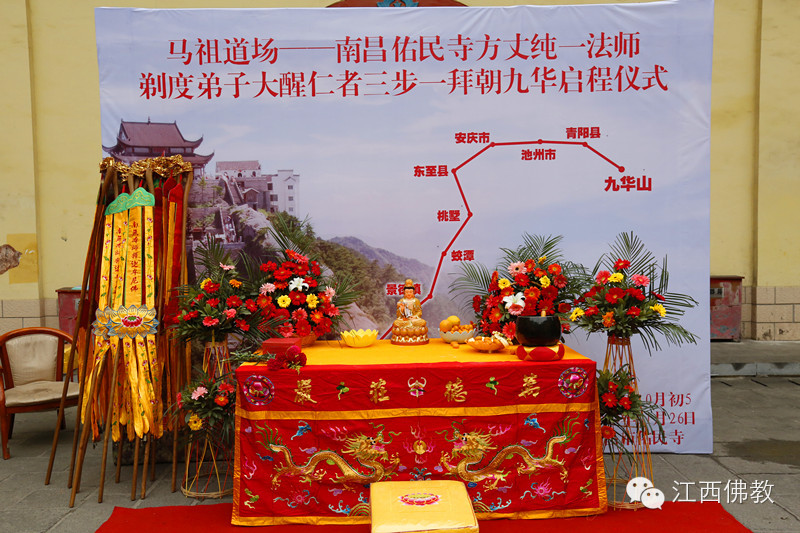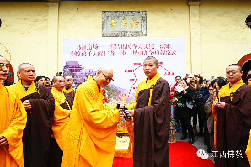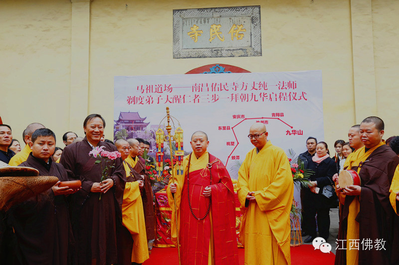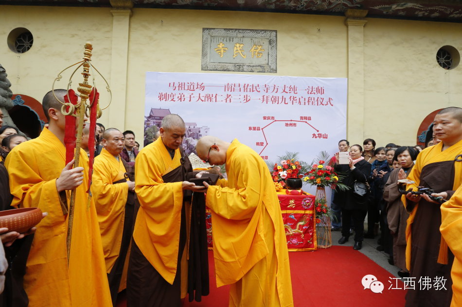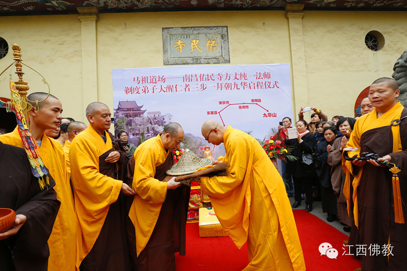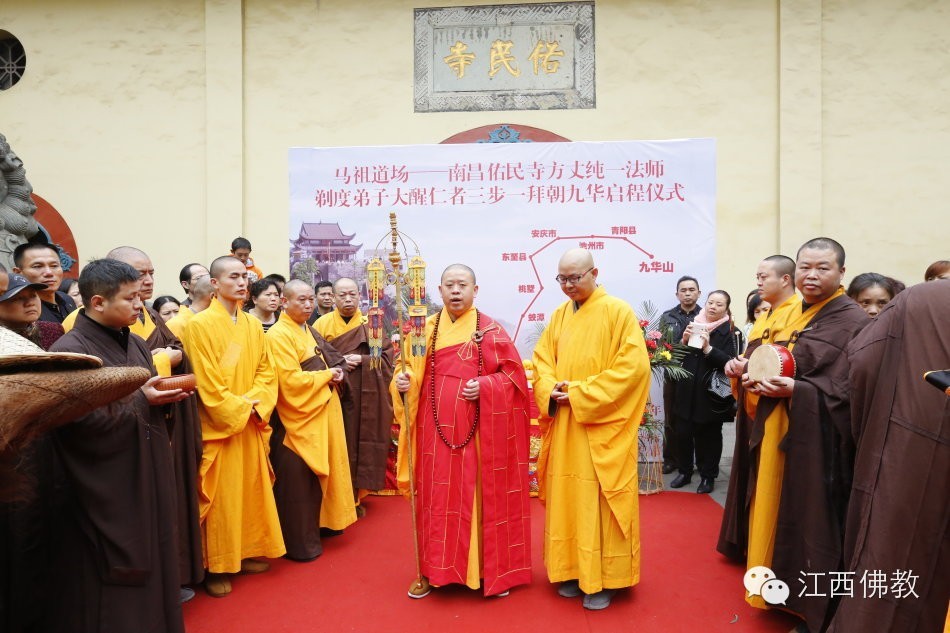 2014年11月26日(达摩祖师圣诞日)上午8时30,南昌佑民寺两序大众及自发前来的护法檀越500余人,云集天王殿前,庄严举行童行沙弥大醒仁者三步一拜朝九华的启程送行仪式。